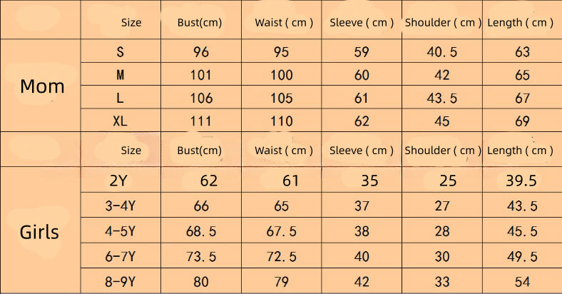 Suitable height: S for Mother, Mother M, mom size L, mother XL, girl 2Y, girl 3-4Y, girl 4-5Y, girl 6-7Y, girl 8-9Y